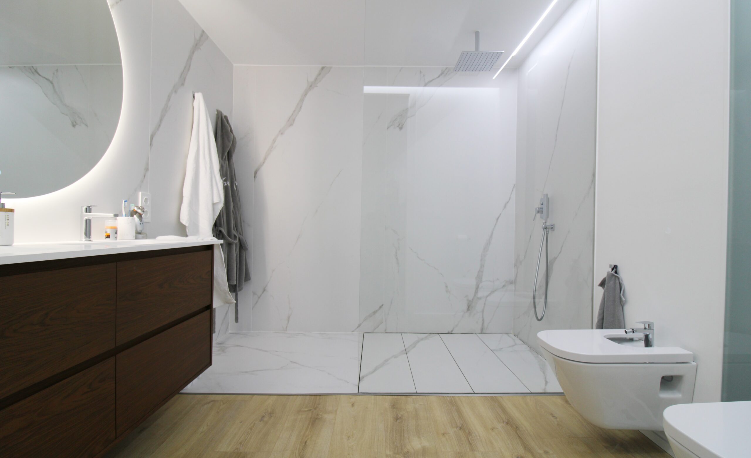 En esta reforma de baño con azulejos XXL, hemos apostado por un diseño elegante y funcional, donde la continuidad visual y los materiales