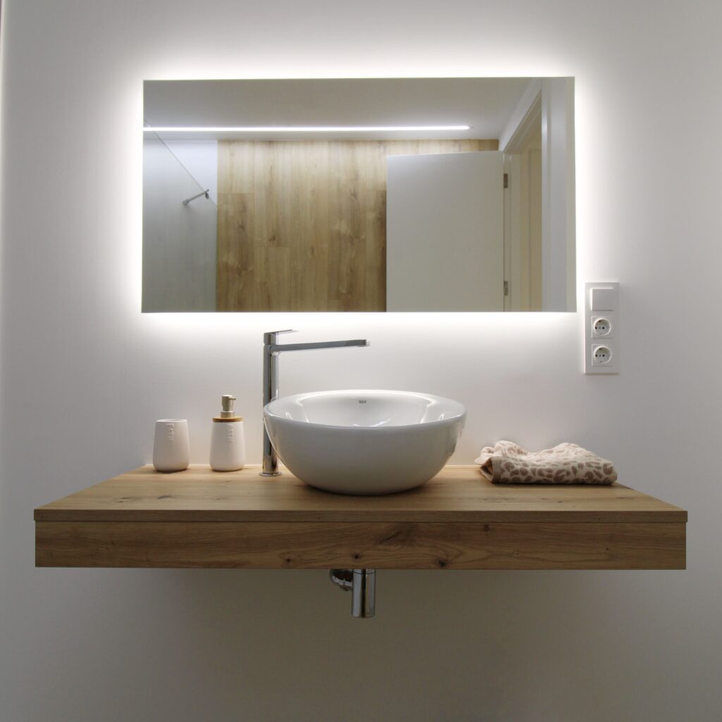 El mueble del lavabo ha sido diseñado y fabricado a medida, combinando a la perfección con el tono del pavimento para mantener una estética homogénea y equilibrada. Su diseño funcional aporta almacenamiento sin romper la sensación de amplitud y fluidez en el baño.