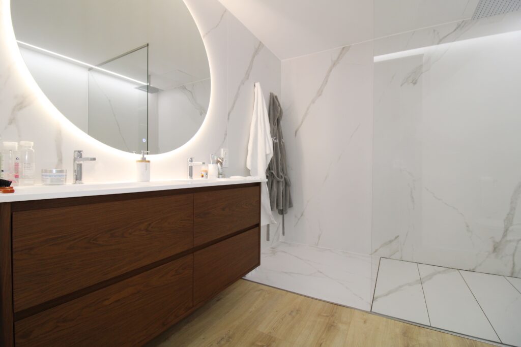 El mueble del baño ha sido diseñado a medida, con un acabado en Nogal natural, aportando calidez y sofisticación al espacio. La encimera de Krion no solo añade un toque contemporáneo, sino que también ofrece resistencia y fácil mantenimiento. Como broche final, un espejo redondo de 120 cm de diámetro con iluminación LED completa el conjunto, realzando la iluminación y el diseño del baño.