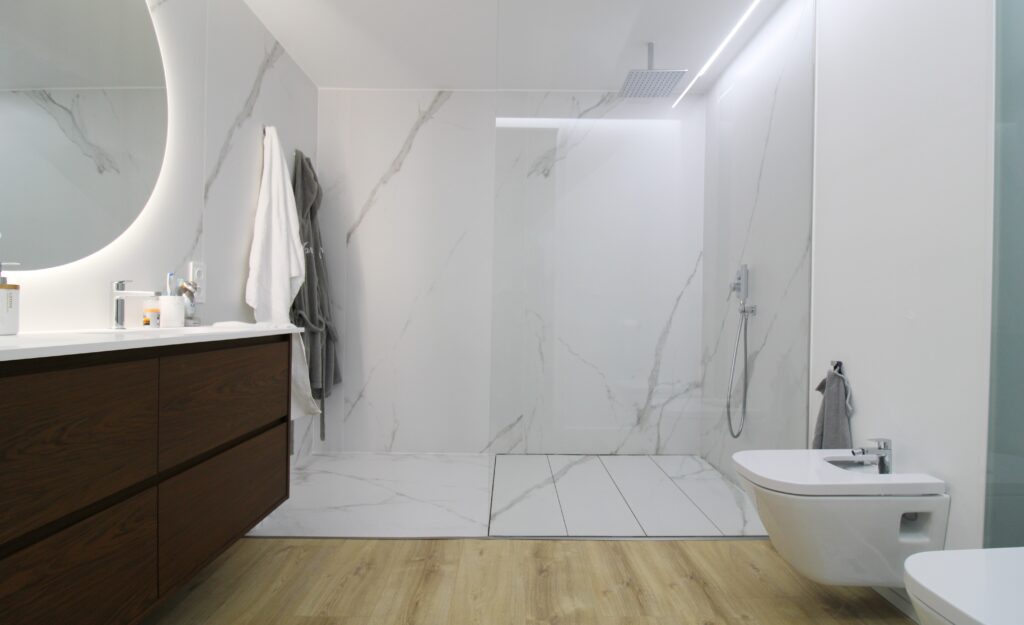 Para el pavimento y revestimiento, hemos elegido el modelo Tholos White de Argenta, un azulejo de gran formato (120×280 cm) que minimiza las juntas y crea un efecto de continuidad y profundidad. Esta elección potencia la sensación de amplitud y luminosidad en el baño.