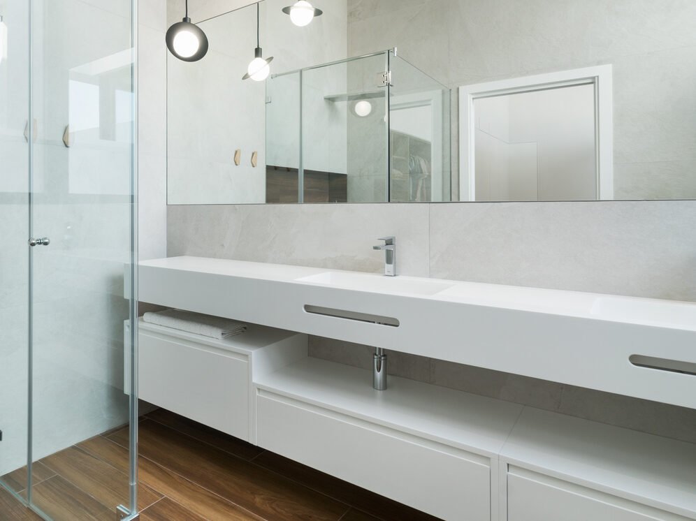 Lavabo a medida en Corian y grifería empotrada de alta gama