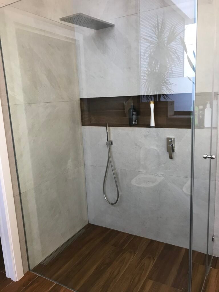 La ducha se integra de forma natural en el espacio, utilizando el mismo pavimento que el resto del baño, y rematada con una canaleta lineal de 70 cm, que garantiza un drenaje eficiente sin romper la estética. Como detalle especial, se ha incorporado una hornacina revestida con el mismo pavimento, rematada con cantos ingleteados, lo que proporciona una solución práctica y visualmente impecable.