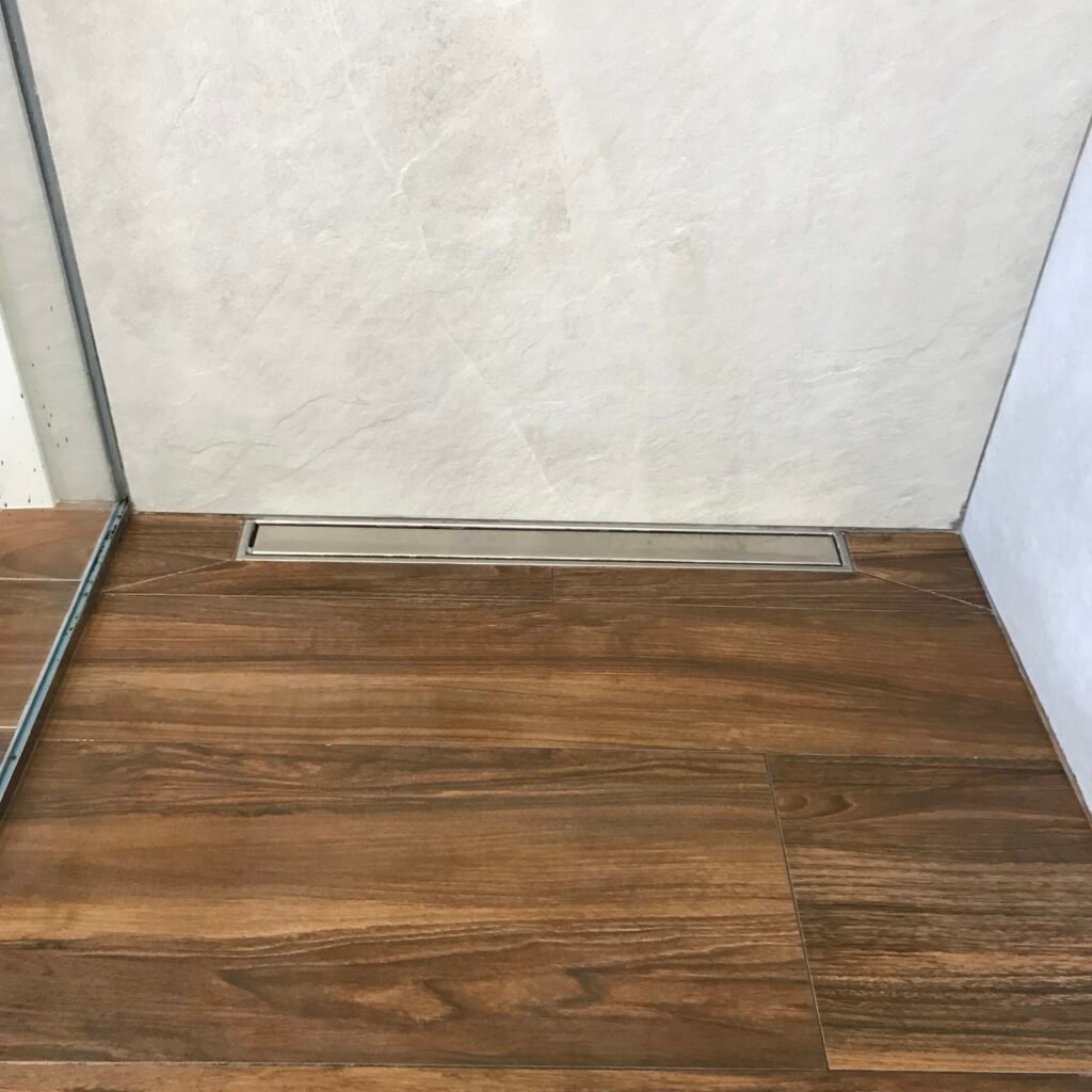 Ducha integrada con canaleta lineal y hornacina con acabado ingleteado