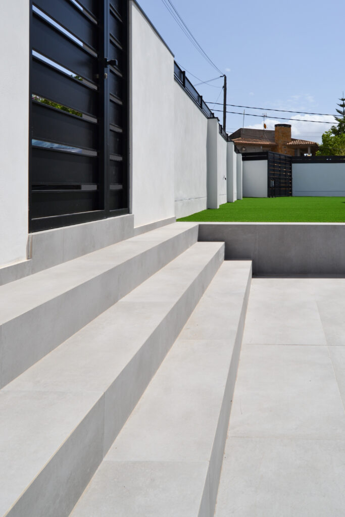 Las escaleras exteriores se han hecho con peldaños a medida para que tengan este acabado tan espectacular. Como curiosidad, a la mesa de la terraza se le ha añadido el mismo azulejo efecto mármol blanco que el del baño