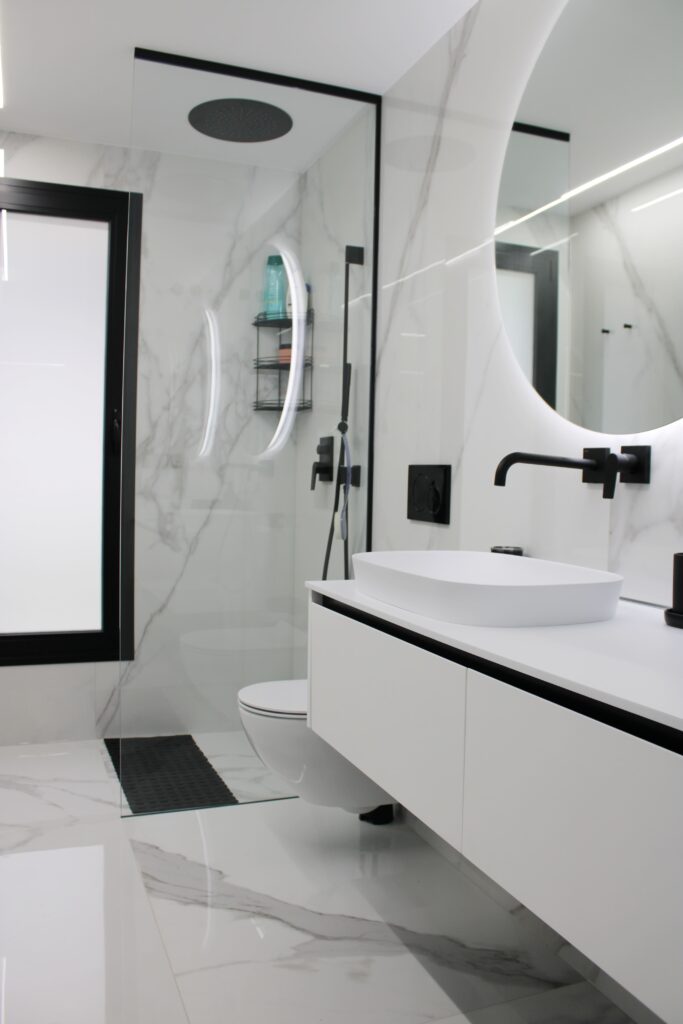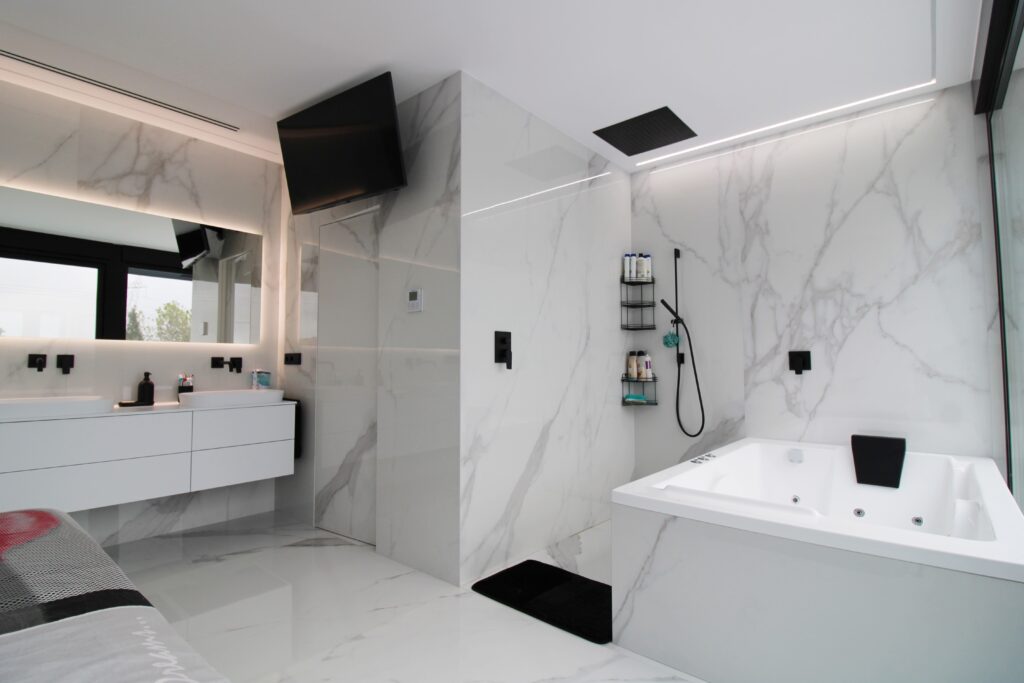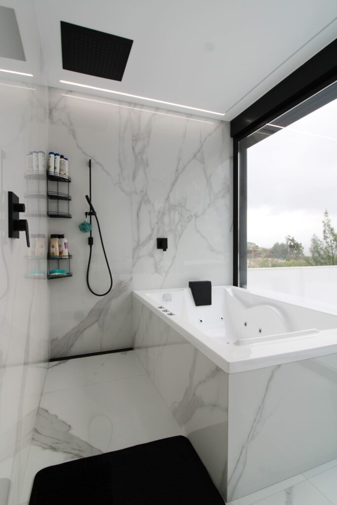 El baño principal del chalet ha sido diseñado para destacar su modernidad y luminosidad. Hemos optado por azulejos de gran formato de gres porcelánico con un elegante efecto mármol blanco. Esta elección no solo aprovecha al máximo la luz natural que entra a través del gran ventanal, sino que también crea un ambiente de lujo y serenidad.