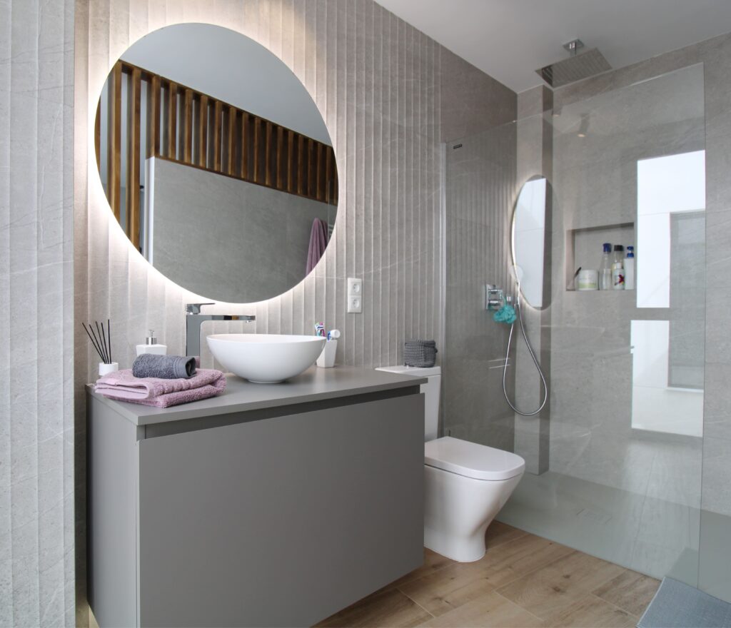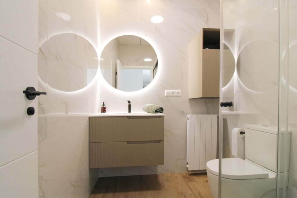 El baño de la planta baja destaca por su revestimiento en azulejo efecto mármol blanco brillo, que refleja la luz y aporta amplitud al espacio. Para completar el diseño, se ha incorporado un espejo retroiluminado redondo y un mueble de baño Fiora Bath Synergy en acabado capuccino, combinando a la perfección con el pavimento.