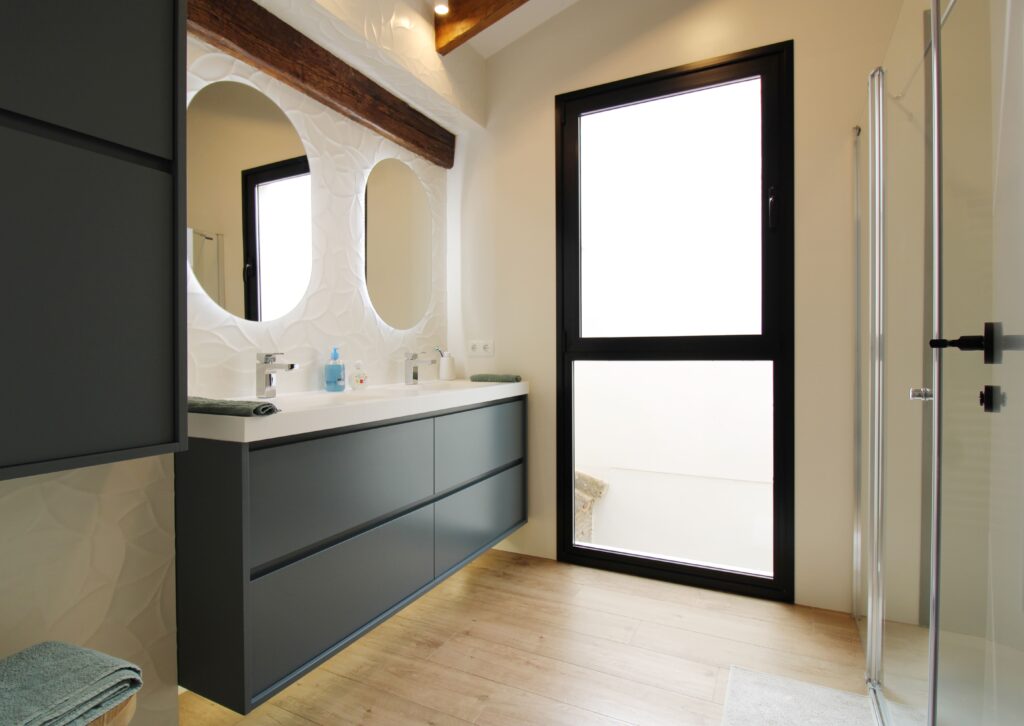 En el baño principal, se ha optado por el azulejo Trevi Grey de PorcelaniteDos, creando un ambiente moderno y elegante. La grifería pertenece a la colección Vernis Shape de Hansgrohe, garantizando calidad y diseño. El mobiliario, diseñado a medida en acabado Cenere, se complementa con un espejo retroiluminado, aportando un toque de sofisticación.