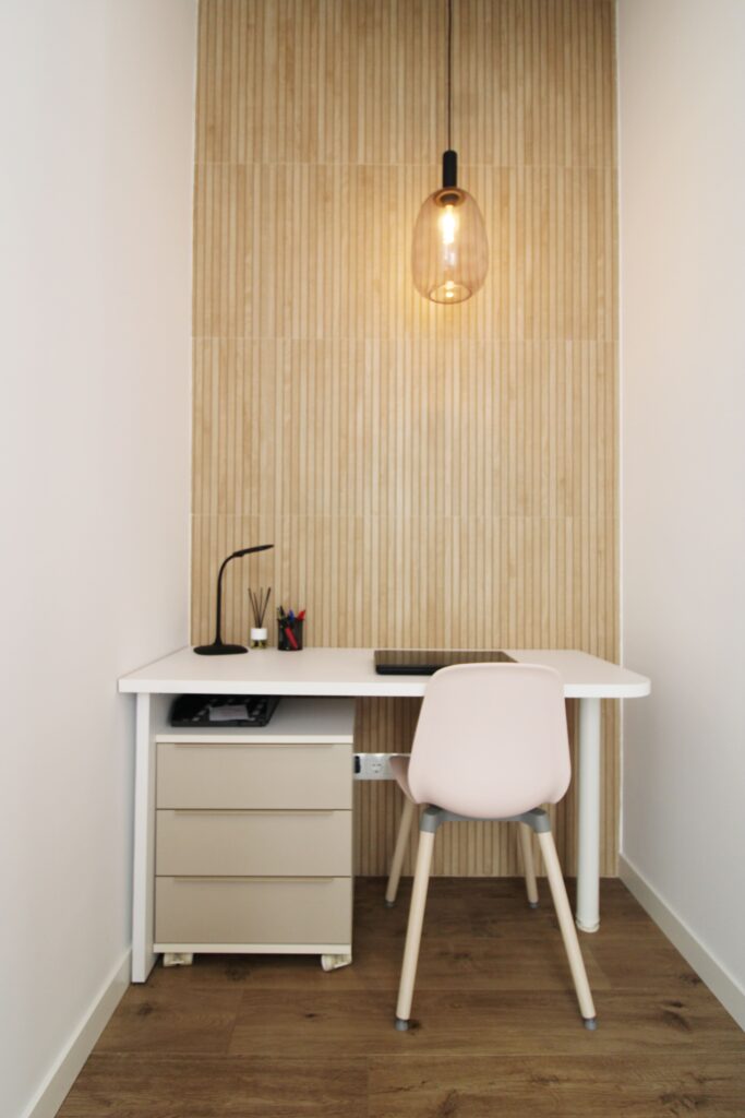 La zona de estudio ha sido diseñada para favorecer la concentración y el confort. Para ello, se ha utilizado el azulejo Ibero Arkwood de Ibero Ceramics, un acabado que imita la madera y aporta calidez al espacio, convirtiéndolo en un rincón perfecto para el trabajo y la creatividad.