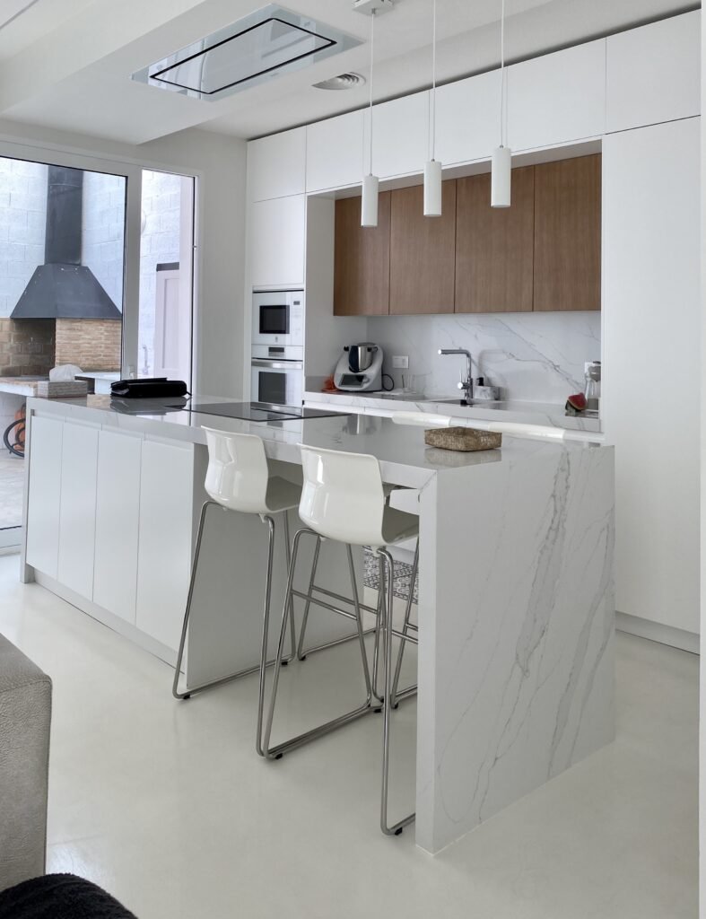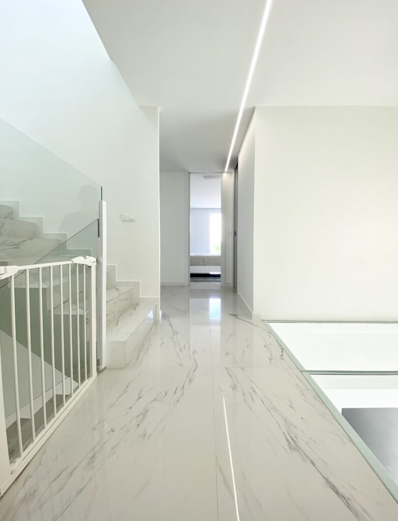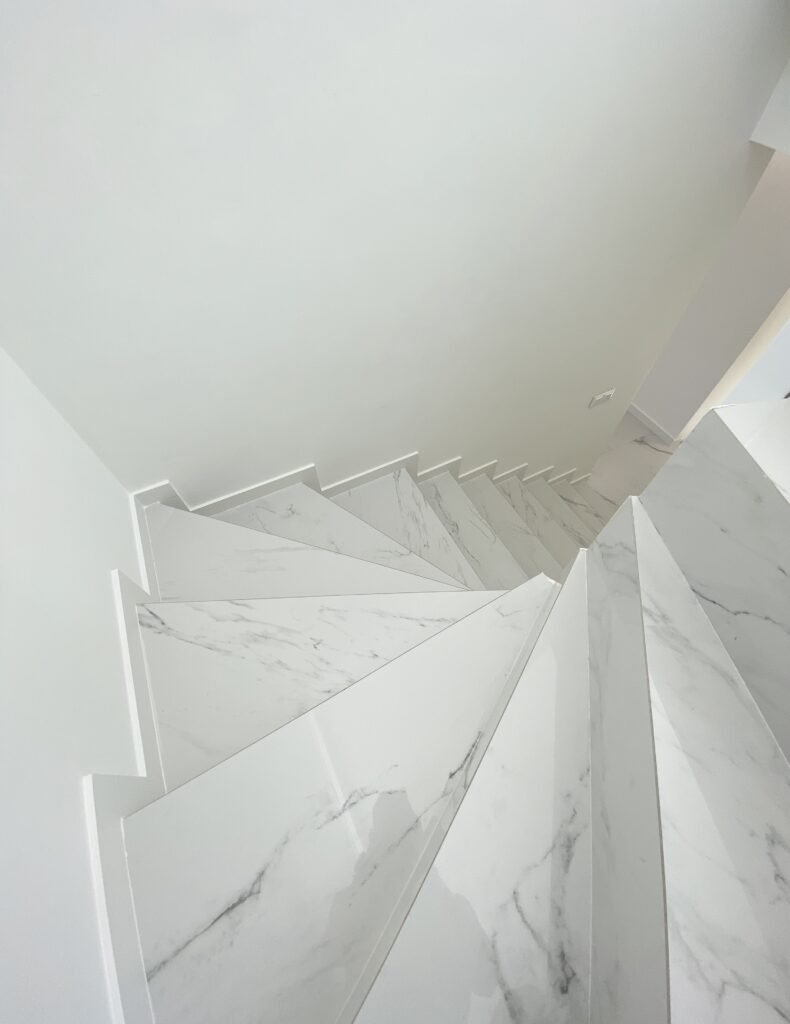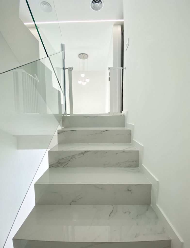 La escalera interior ha sido diseñada con especial atención al detalle. Se han fabricado peldaños a medida con el mismo pavimento Marbleplay White, y se han rematado con ingleteado, garantizando una continuidad impecable en el diseño y un acabado minimalista y elegante.