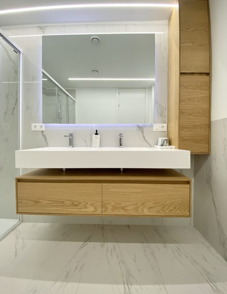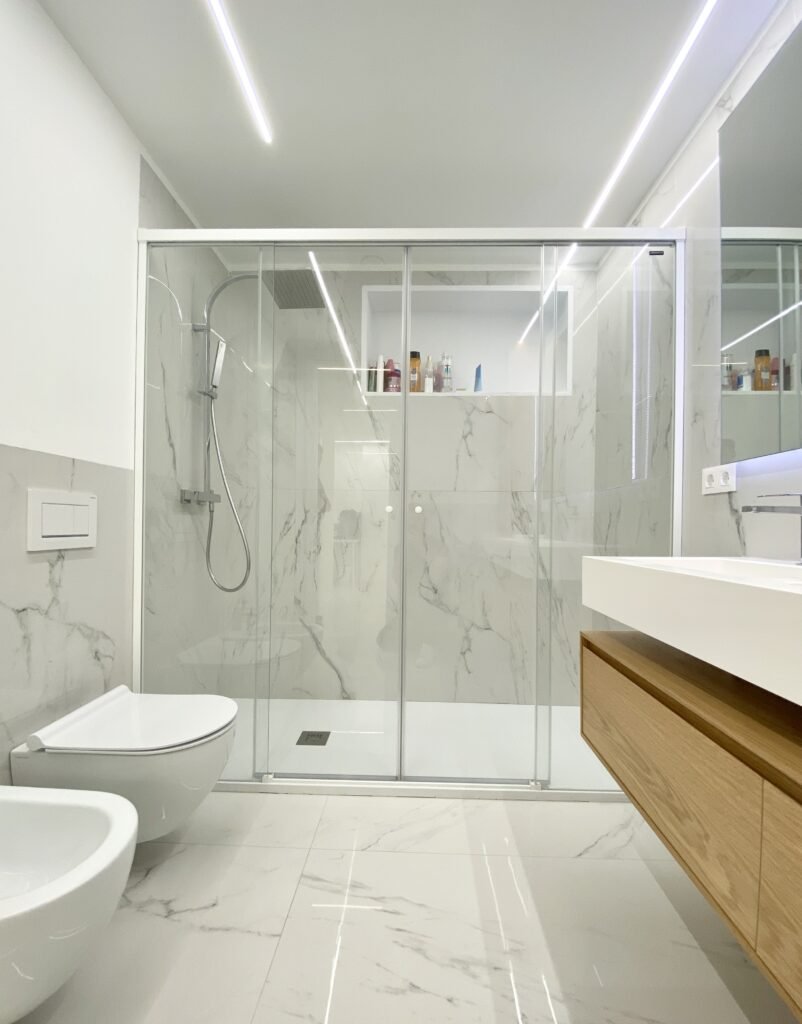 En el baño principal, el pavimento Marbleplay White se extiende también por todas las paredes, potenciando la sensación de amplitud y luminosidad. El espacio se completa con un mueble suspendido a medida, una encimera de diseño exclusivo y un espejo retroiluminado, que en conjunto aportan modernidad y ligereza visual. Los sanitarios elegidos, inodoro y bidé suspendidos de la prestigiosa marca Catalano, refuerzan la limpieza de líneas y la practicidad del conjunto.