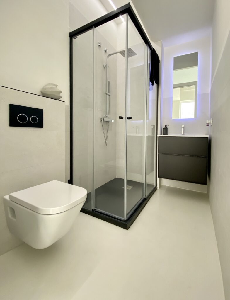 El aseo destaca por su fuerte personalidad. Se ha optado por el modelo Work White de Marazzi para el pavimento, combinando con una cuidada selección de detalles en negro: desde la mampara y el plato de ducha hasta el mueble y el pulsador. El resultado es un espacio compacto pero con gran carácter visual, moderno y bien resuelto.