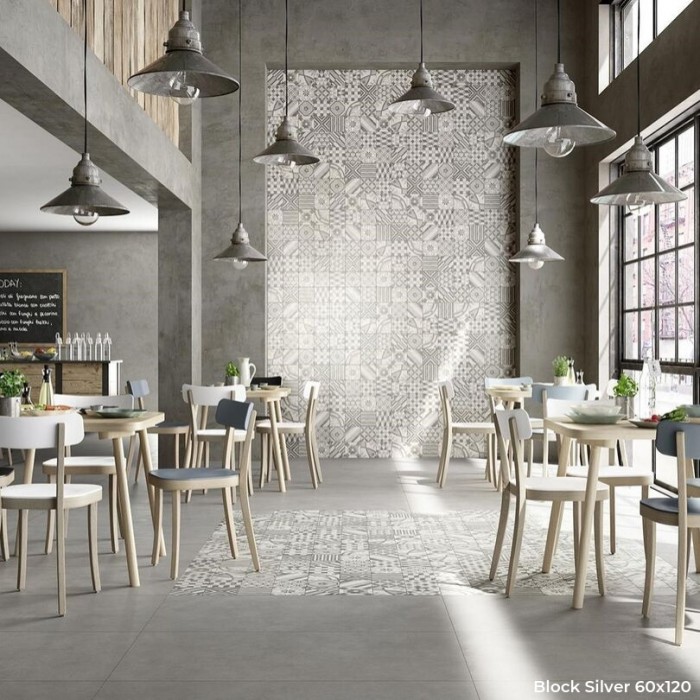 Los azulejos de cerámica de Block, fabricados con gres fino porcelánico, se caracterizan por presentar una superficie espatulada en la que se alternan los efectos brillantes y mates.